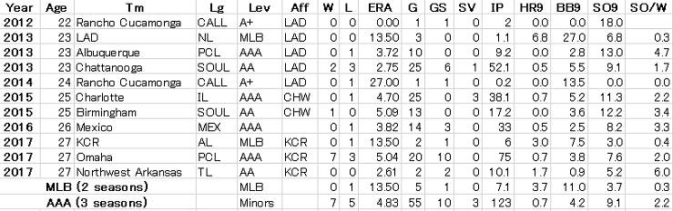 奪三振能力はまずまずなんですが四球が多過ぎでここを矯正できるかどうかでしょうか。左投げ、28歳とまだ若いこともあり可能性はあるかもしれないですね。